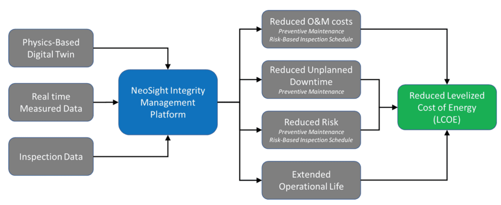 One critical tool that has significantly helped reduce unexpected failures in offshore wind farms is asset integrity management. Stress Engineering Services, Inc. has developed an asset integrity management platform for offshore structures called NeoSight, which uses physics-based digital twins to predict failures by tracking the system health (i.e. loads, stresses, fatigue damage, corrosion). NeoSight reduces risk, decreases operations & maintenance (O&M) costs and provides the data needed to justify operation beyond the design life.