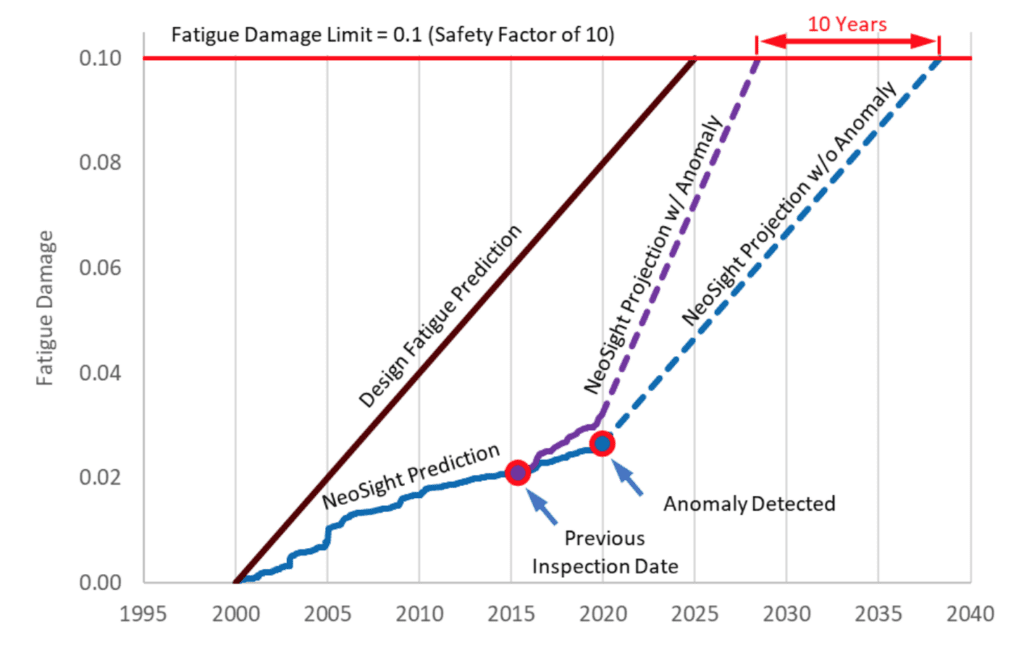 - The fatigue damage predicted from NeoSight is accumulating at a slower rate than the design prediction.